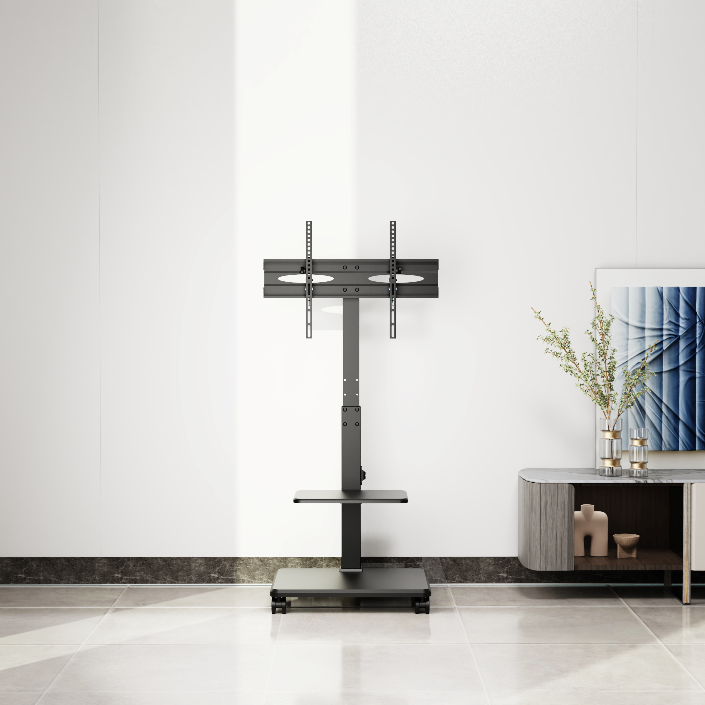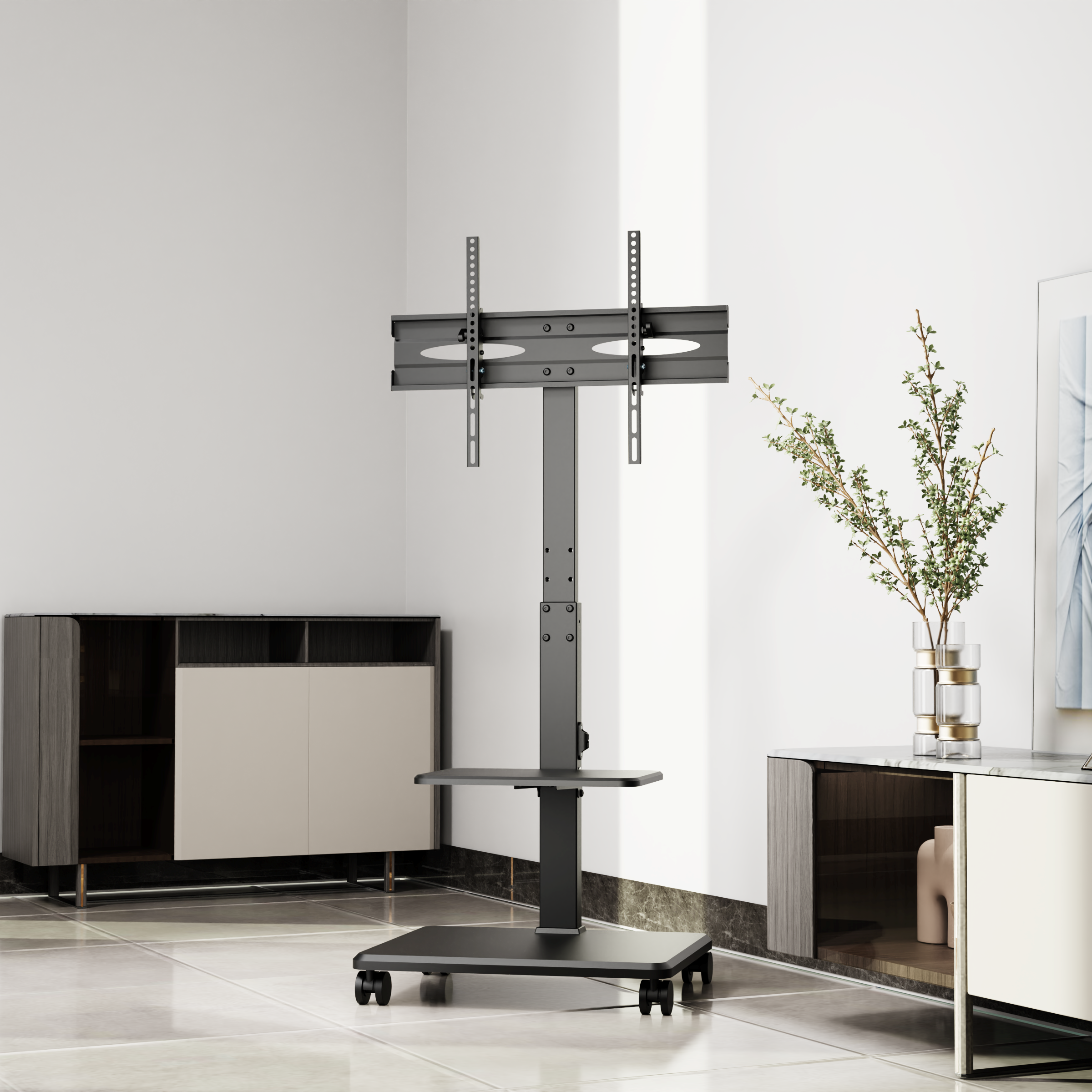 TVC02-64P:Optimize your viewing comfort and storage convenience with the TVC02-64 TV Cart. Designed for superior stability and easy mobility, it functions perfectly as a standalone TV mount or integrates smoothly with TV cabinets to create a clean, organized room layout. Enjoy simple setup, smooth tilt and height adjustments, plus a removable equipment shelf—all thoughtfully designed for user ease.