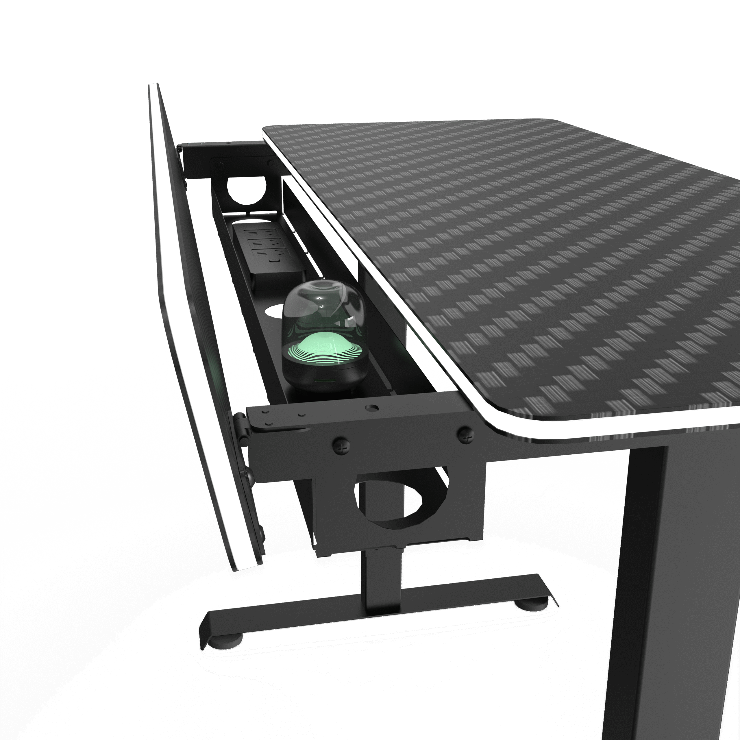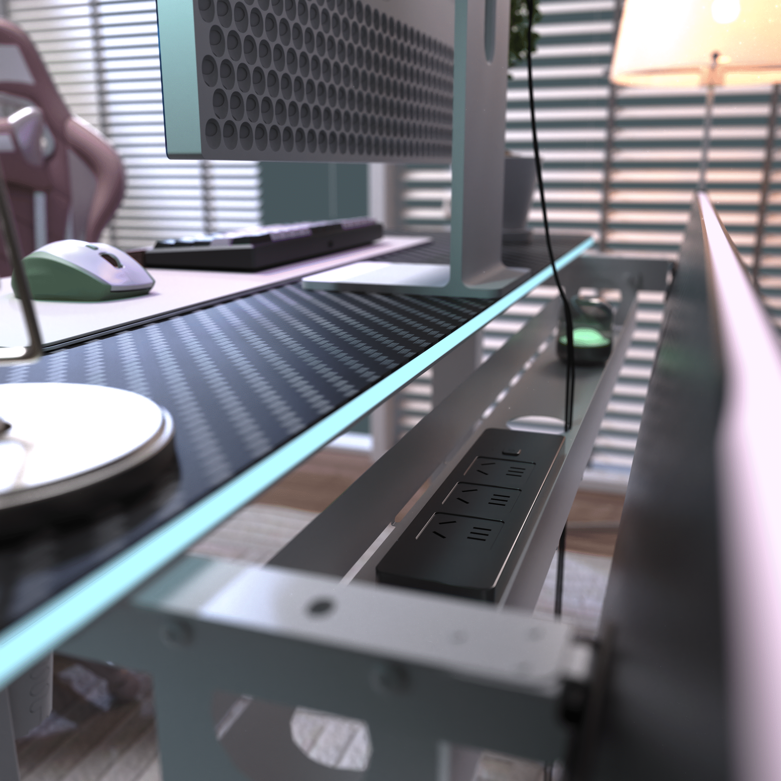 The ES09 Series gaming desk features integrated fiber optic lighting along its edges, designed to deliver an immersive combat experience. For a streamlined setup, it includes two convenient cable grommets.The desk combines a refined metallic finish with robust stability, supporting up to 60kg of weight.